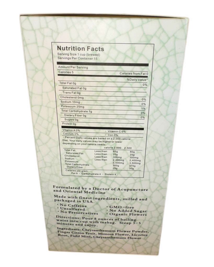 Expertly blended and crafted by Dr. Lisa Jeong, our Anti-Stress/Anxiety Tea will help smooth the Liver Qi aiding in calming our souls leading to better at coping with our daily stresses. Sweet fragrant from the Licorice combined with peppermint infused tea, leaves us feeling refreshed and up lifted as channels are opened. The combination of Finger Citron Fruit and Mimosa Flower (Happy Flower in Chinese) helps boost our moods and keep our souls calm. Chrysanthemum Flowers enhance the flavors and add balance to this perfect relaxing formula.