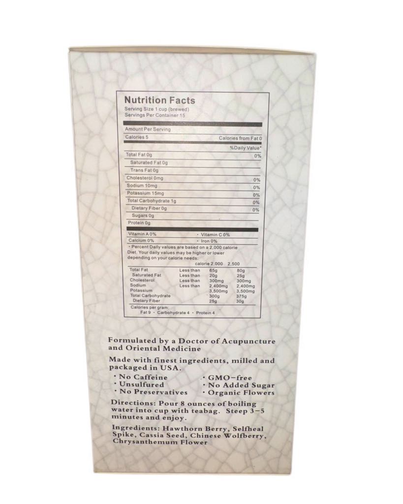 Expertly blended and created by Dr. Lisa Jeong, our Reset/Health Tea supports Kidney functions to aid in Endocrine balance and energy boosts. Sweet scent of the Gou Qi Berries (Chinese Wolfberry) brightens the palate and nourishes the Liver and the Kidneys. Selfheal Spike and Cassia Seed lowers hypertension and cholesterol. This perfect blend of herbs with Chrysanthemums produces a charming aroma, resets the body and organ systems.