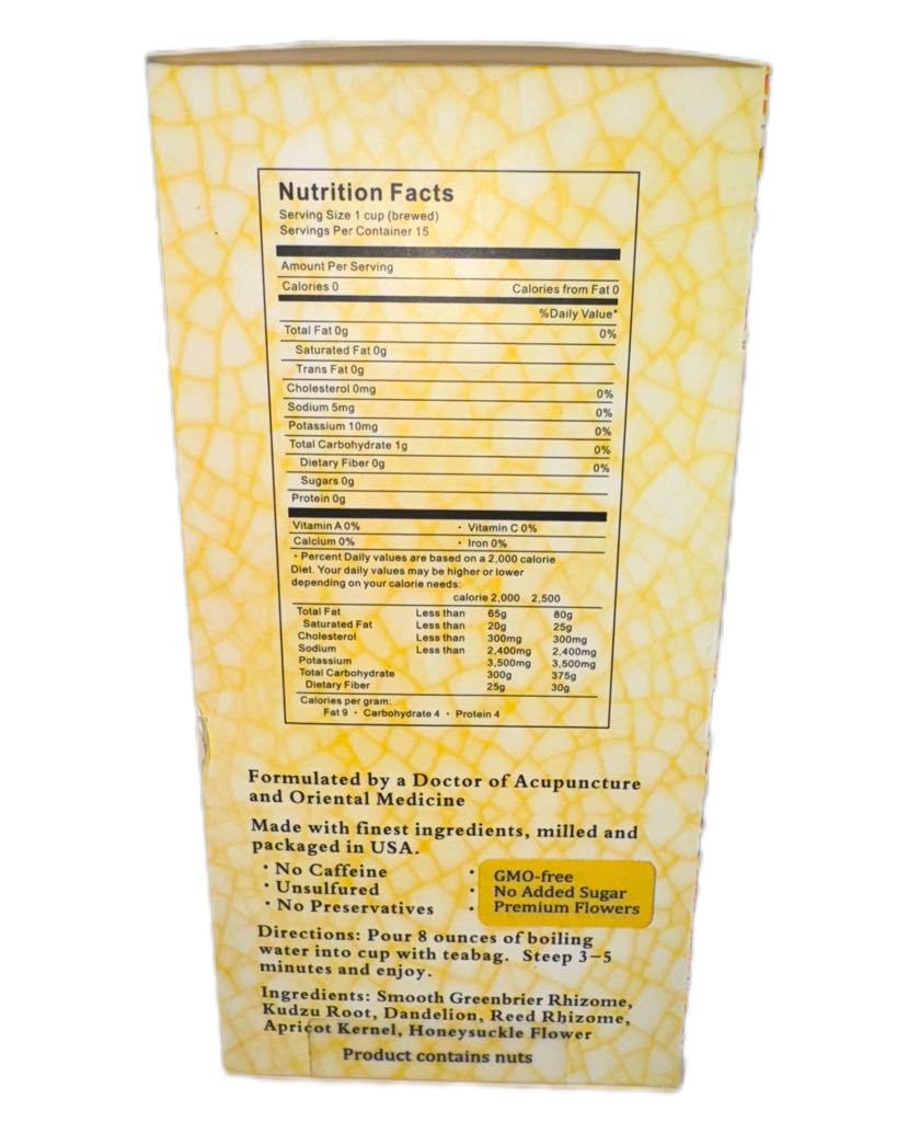 Our Skin Detox Tea has a soothing taste with a hint of almond from the Apricot Kernel, which has been used for centuries for beautifying the skin as it moistens the organ system as a way of detox. Other detox herbs include the Kudzu root and Dandelion, both gentle in flavors. Combined with Tu Fu Ling (Smooth Greenbrier Rhizome) creates a mellow flavor like barley soup with a Honeysuckle finish.